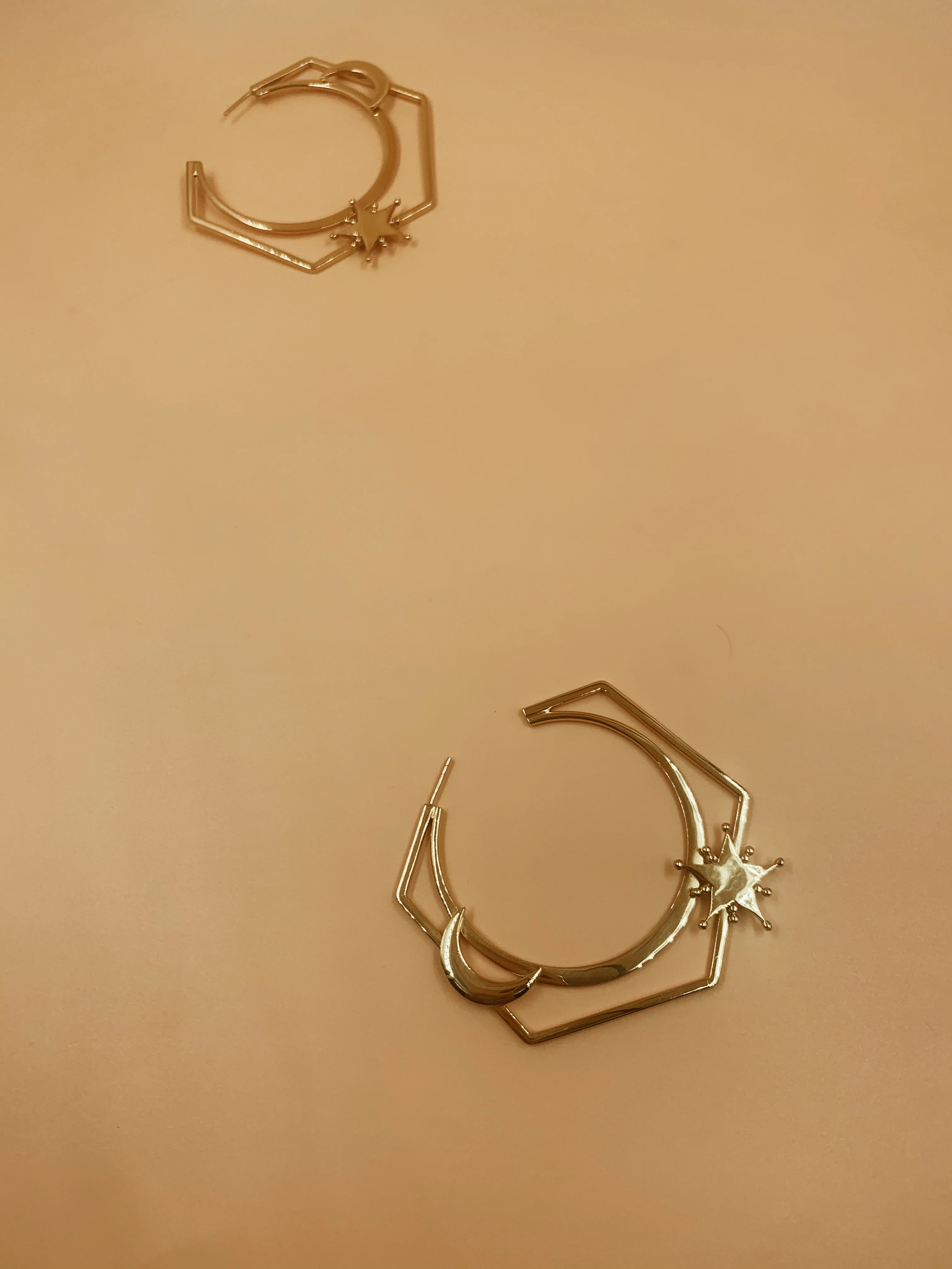 Channel major 70s vintage-boho style with the Celeste hoops. Eye-catching, neck-grazing and statement-making, these hoops have our signature Mama Crescent and a sparkly, shining star. Equal parts luminous and sparkly gold.